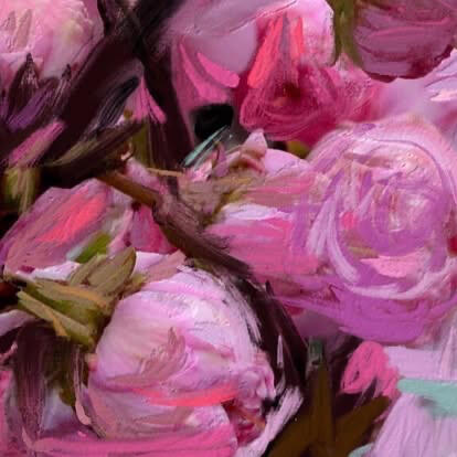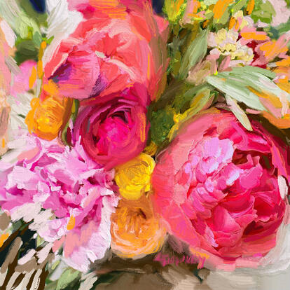 Lorraine Downey's paintings are characterized by a dynamic and expressive use of brushstrokes. She uses a variety of brushes, palette knives, and other tools to apply thick layers of paint onto the canvas, creating a textured surface that is full of movement and energy.