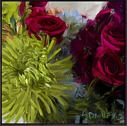 Downey's brushstrokes are often loose and gestural, emphasizing the physical act of painting and the artist's creative process. Her use of color is also bold and vibrant, which further accentuates the dynamic quality of her brushwork. Overall, her artworks are known for their strong visual impact and the sense of movement that is created by her energetic brushstrokes.