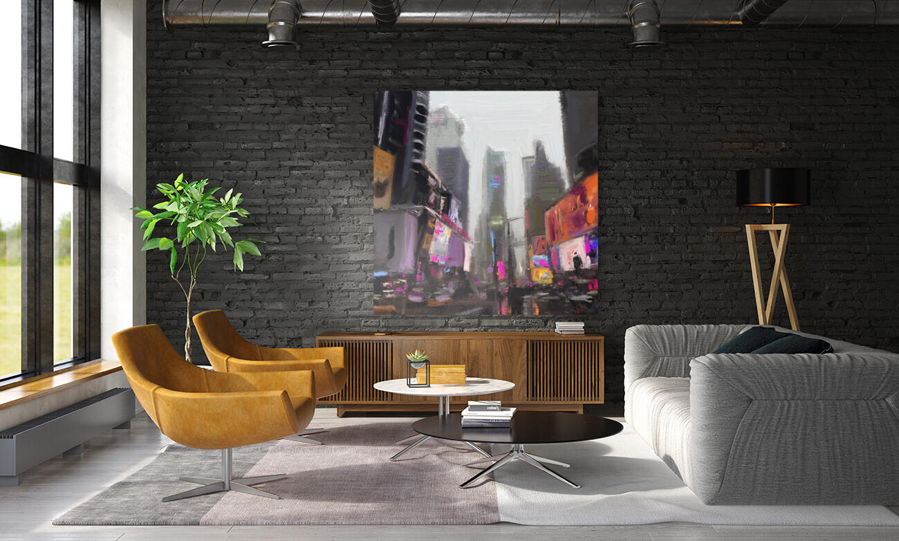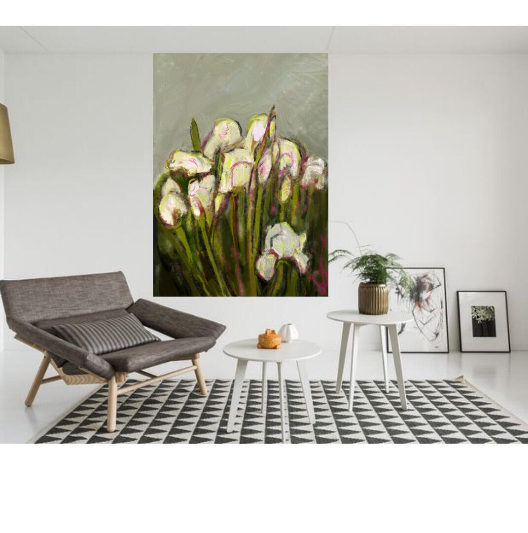 Her artwork often features large canvases, which allow her to create expansive, dynamic compositions that convey a sense of energy and movement. She often works on canvases that are several feet wide and tall, which provide ample space for her to create sweeping brushstrokes and layered textures.